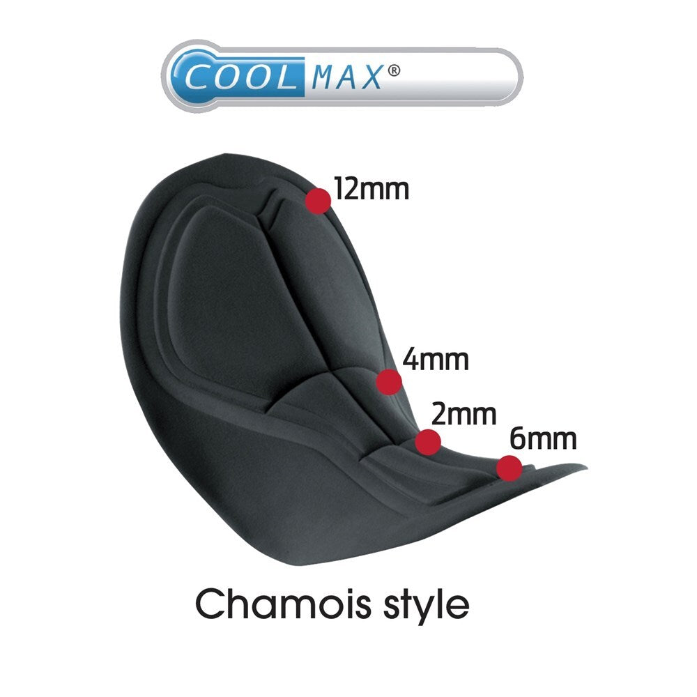 - COOLMAX chamois padding is thicker in the seat where it is needed, and thinner elsewhere so no unnecessary bulk.